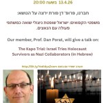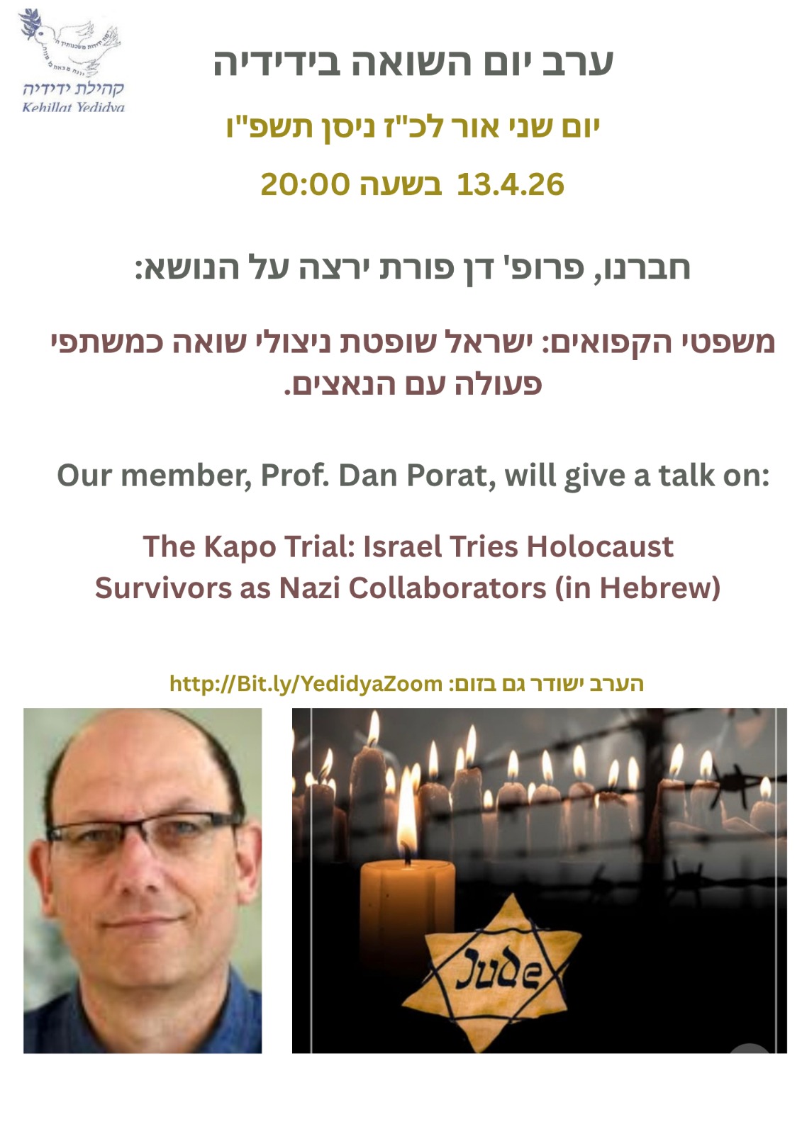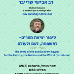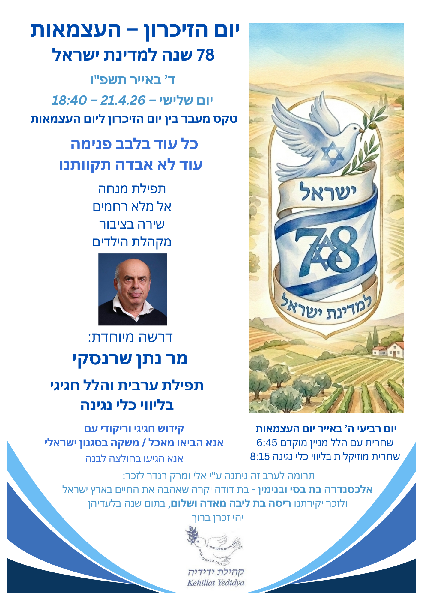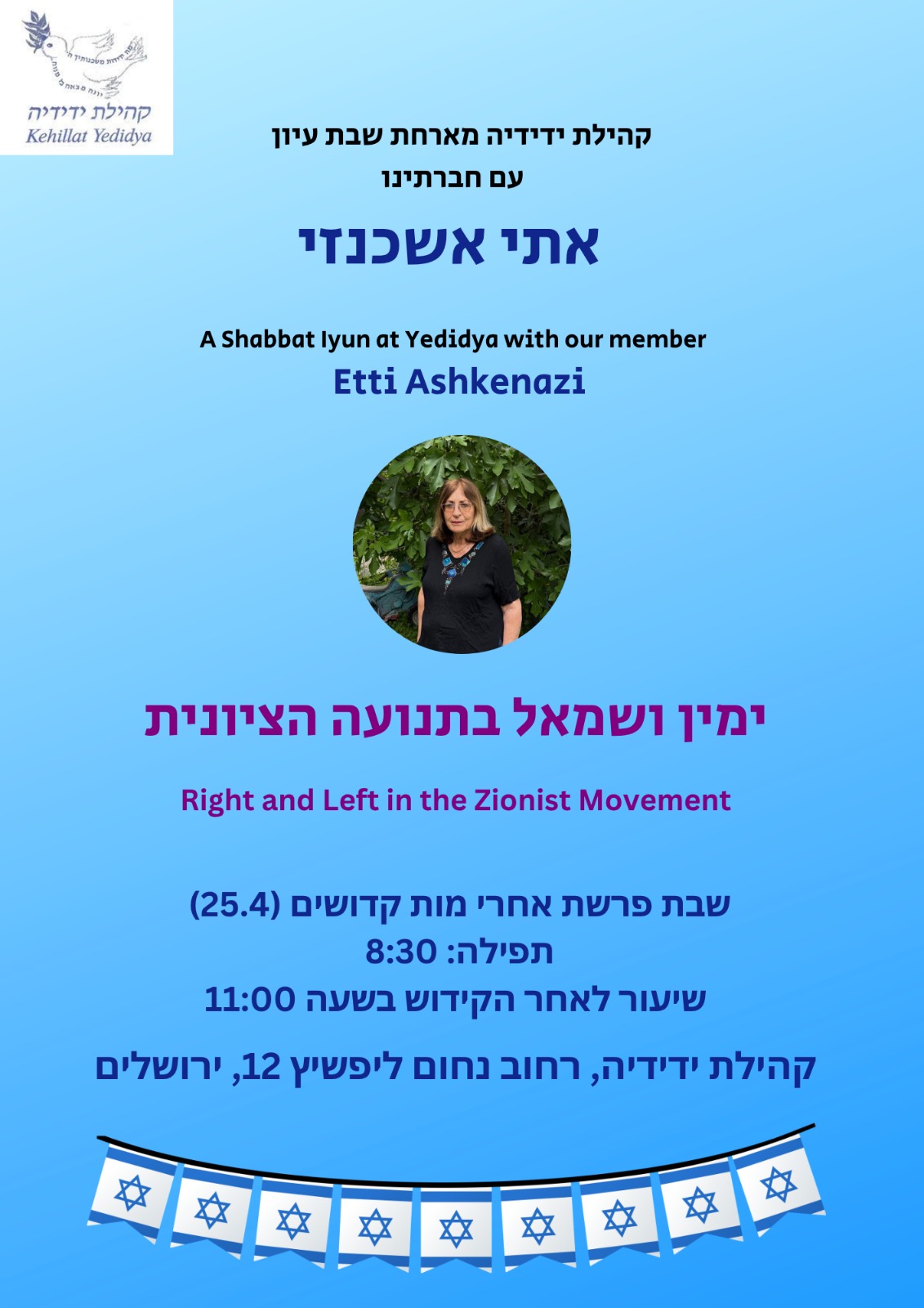 | שבת עיון – בשבת פרשת יתרו אחרי הקידוש בסביבות השעה 11:00 הקהילה מוזמנת למפגש עם הגב׳ יעל אדר אימו של החלל החטוף מקיבוץ ניר עוז – תמיר אדר הי״ד יעל אדר תדבר על האירוע של ה-7 באוקטובר והשלכותיו, השיח על החללים והערבות ההדדית. עלון פה | Shabbat Iyun – Shabbat Parshat Yitro February 7, 2026, after the Kiddush around 11:00 The community is invited to a meeting with Mrs. Yael Adar, mother of the abducted victim from Kibbutz Nir Oz, Tamir Adar הי״ד Yael Adar will speak about the October 7th event and its implications, the discourse on the war dead and mutual responsibility. Flyer here |