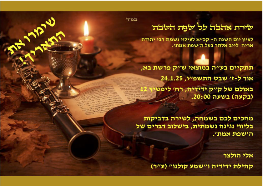 | ליל שירת הבקשות! בליל שבת, פרשת וישב, (12.12)בשעה 20:30 קהילת ידידיה מצטרפת לקהילות ציון, הקהל וכל הנשמה לערב של שירת הבקשות. אנחנו צריכים כמה מתנדבים להביא כיבוד (פירות /פיצוחים). אם אתם מעוניינים, פנו לעליזה בוואטסאפ: 050-7904964 בריבוי נוסחים ומסורות מרחבי העולם היהודי והמנהג הארצישראל המתהווה בתפילה וכוונה לישועות ונחמות בימים ההם בזמן הזה. בהשתתפות פייטנות ופייטנים מהקהילות המארחות. ליל שבת, פרשת וישב, בשעה 20:30 בקהילת כל הנשמה, רחוב אשר 1 | Evening of Shirat HaBakashot! This Friday night, at 8:30 pm, Parashat Vayeshev, 12/12, Kehillat Yedidya is joining Kehillot Zion, Hakhel and Kol HaNeshama for an evening of Piyut and songs after dinner. We are looking for a few volunteers to bring fruit/nuts to the event. If you're able to volunteer, please contact Elyssa on whatsapp: 050-7904964 In a multitude of versions and traditions from across the Jewish world and the emerging custom of the Land of Israel, in prayer and hope for salvation and comfort “in those days at this time.” 8:30 pm at Kol HaNeshama – Rehov Asher 1 |