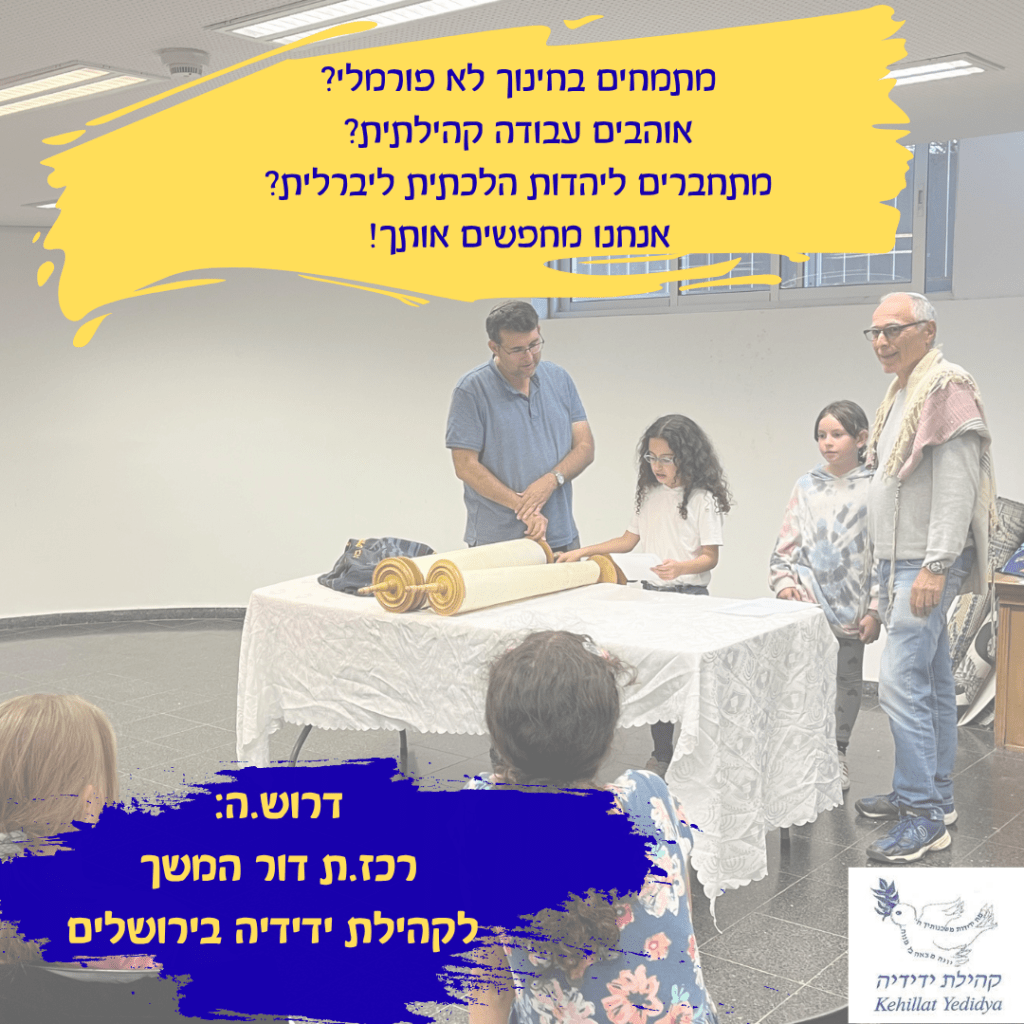 Through its social vision and its commitment to the Torah and mitzvot, Kehillat Yedidya crosses boundaries in Israeli society. It is an active community that works together for a more just, democratic, and pluralist society, while fostering a vibrant communal life of Torah study, mutual aid, and charity.